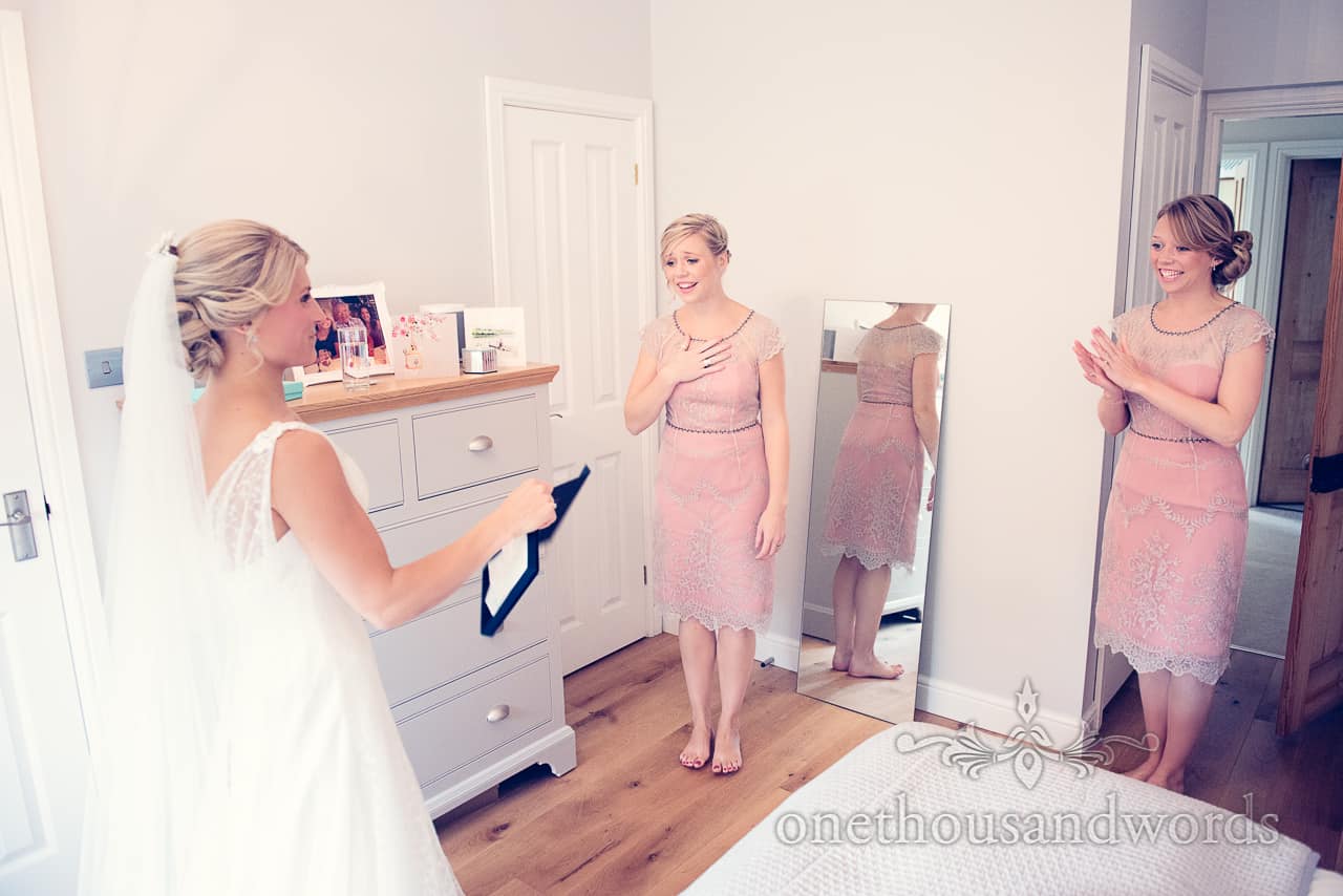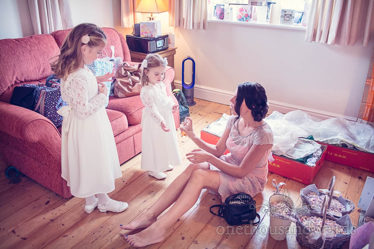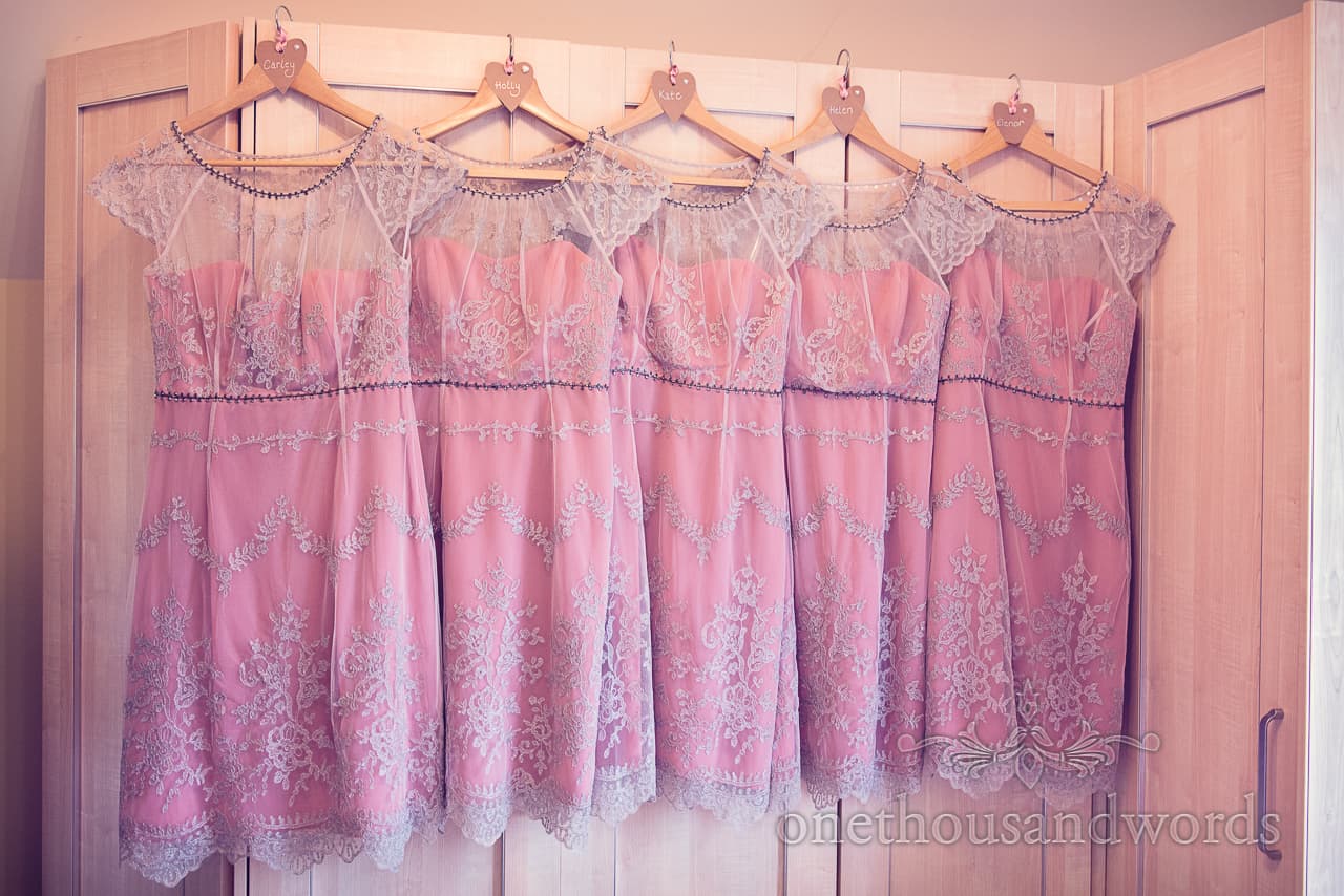 Sarah’s makeup artist was set up in the garden conservatory. This allowed most of the morning wedding photographs to be taken in gorgeous, soft natural light. Inside the house, I found the wonderful pink pastel bridesmaids’ dresses hanging, arranged above all of the girls’ shoes, tagged with personalised labels.