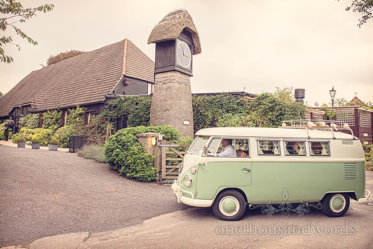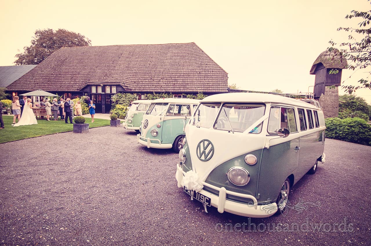 There were three classic VW vans used as wedding transport to The Clock Barn. Sarah and Andrew also had the foresight to hire two large green and yellow classic buses for their guests.