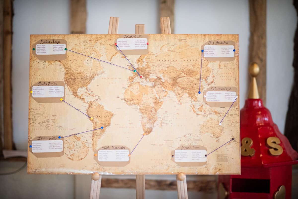Each table had been wonderfully dressed. The retro Map-of-the-world table plan named each table after a destination visited by the happy couple.