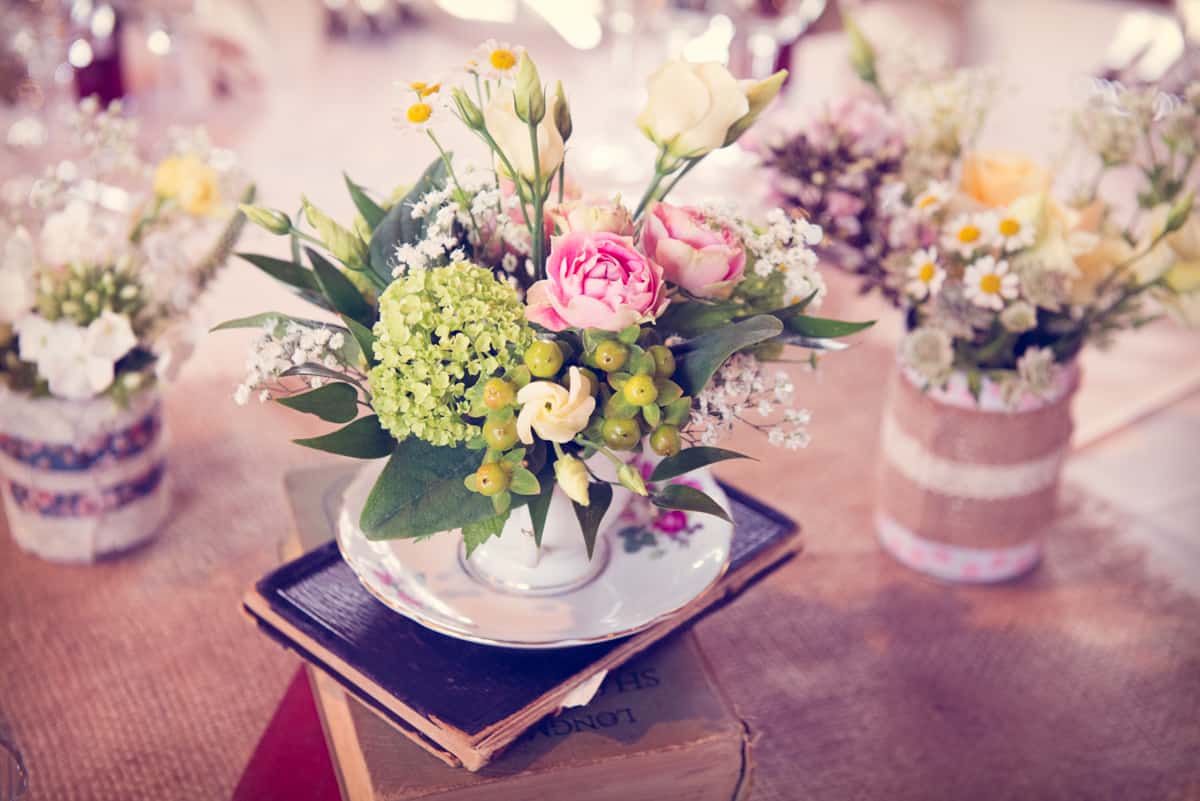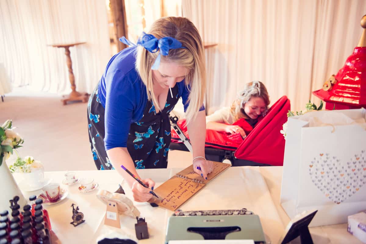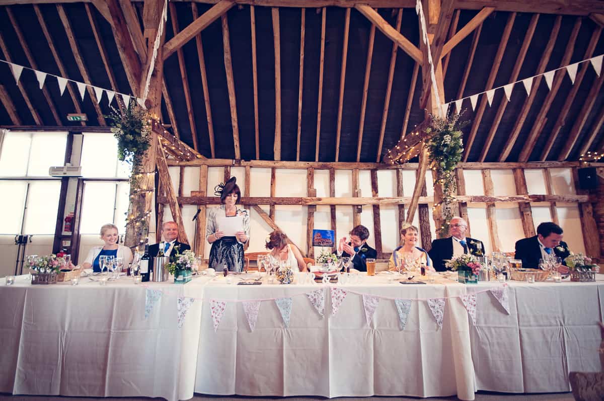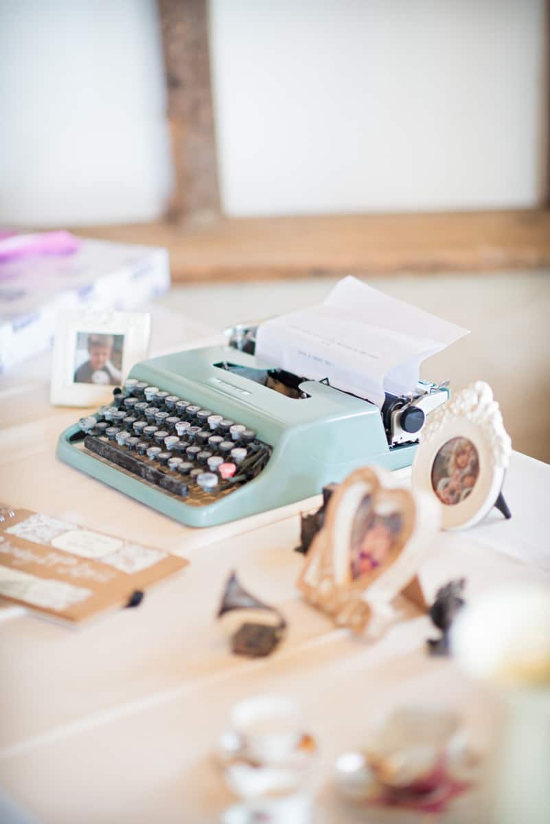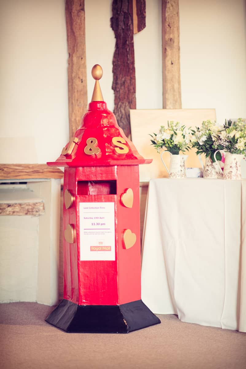 It was the interior decoration of the Clock Barn that took my breath away. The ceremony room had been dressed with wicker love hearts, ribbon-laced flowers. It was this country chic theme that continued into the main wedding breakfast room. Here, the amount of homemade detail was almost overwhelming. Countryside flowers sat in dressed tins on stacks of old books, and bunting hung across the barn as far as the eye could see. A typewriter, retro ornaments, and framed pictures from our engagement photos sat next to the customised guest book. The mother of the bride had even hand-made a full-size, red wedding Royal Mail post-box.