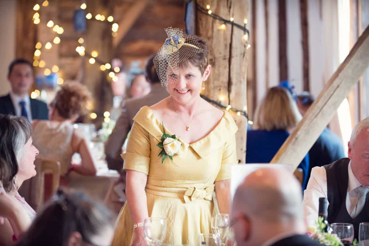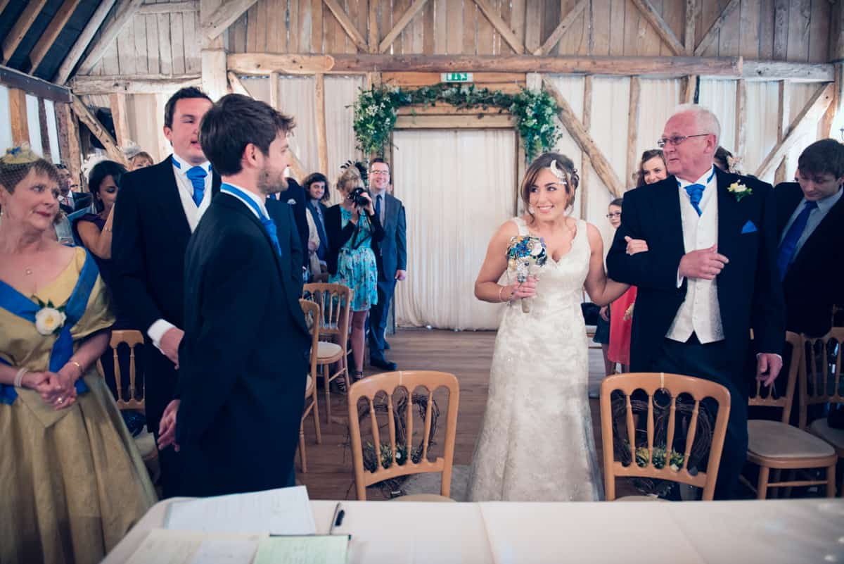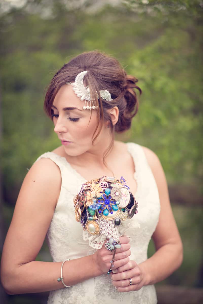 The Clock Barn is fairly unique in that it has its own bridal preparation room adorned with retro wallpaper and furnishings. This was the perfect setting for final hair and makeup adjustments, whilst the wedding guests arrived. Sophie revealed her bouquet. The like of which I had never seen before – entirely made of brooches. It fit the day’s theme and complemented her dress perfectly.