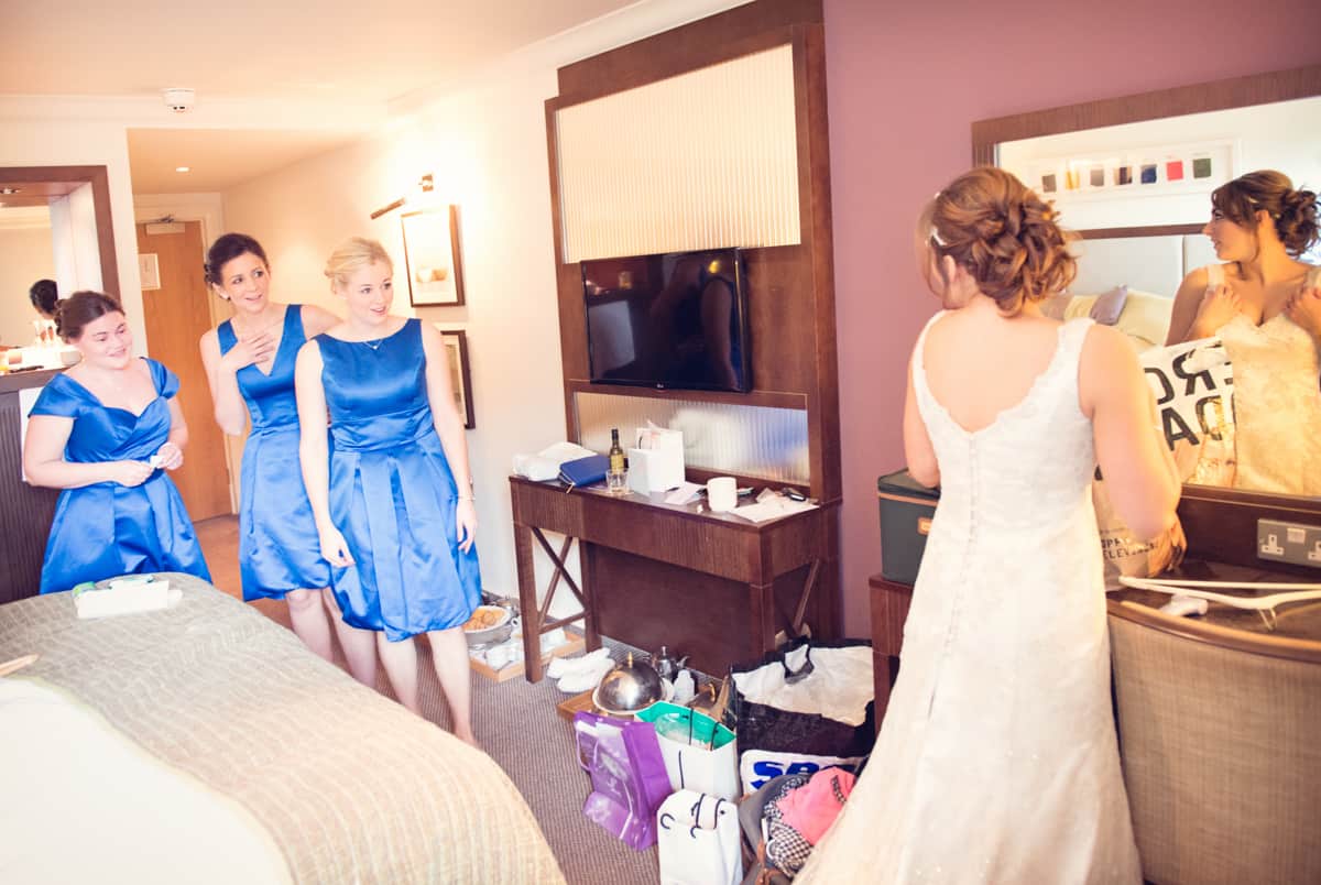 Hair was styled and makeup was applied with such relaxed humour, all the time Sophie looking particularly serene. The girls donned their sapphire blue dresses, and Sophie’s mother helped her into her stunning wedding dress by Forget Me Not Designs. The bridesmaid’s reactions to seeing Sophie in her dress were fantastic, even bringing a tear to my eye.