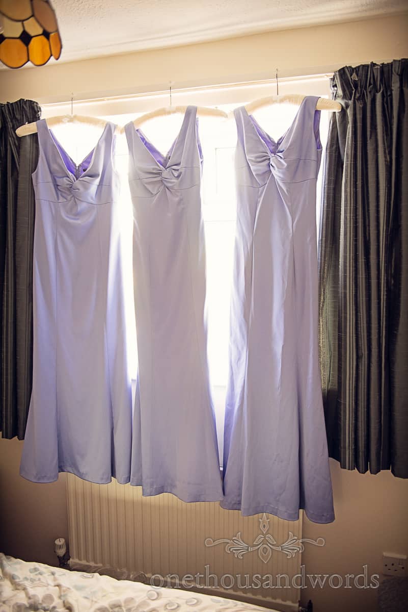 In the back bedroom, the beautifully detailed wedding dress hung next to the four blue bridesmaids dresses. They overlooking the wedding day shoes.