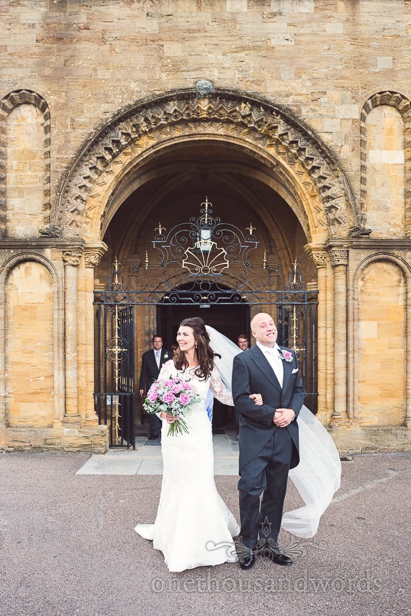 After walking back down the aisle a happily married couple Jess and Tim were showered with a wind-blown curtain of confetti After greeting guests and a lot of laughter we organised a few group wedding photographs set against the backdrop of the huge abbey walls.