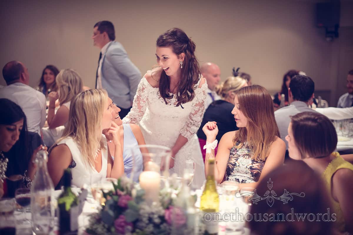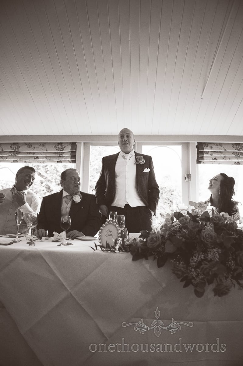 Indoors as the hustle and bustle of the wedding guests seating themselves died down. Jess and Tim were applauded into their wedding breakfast and then treated to some side-splitting speeches. A dark room with a back-lit top table can pose somewhat of a challenge for some photographers. However, we loved working with the available natural light that this provided.